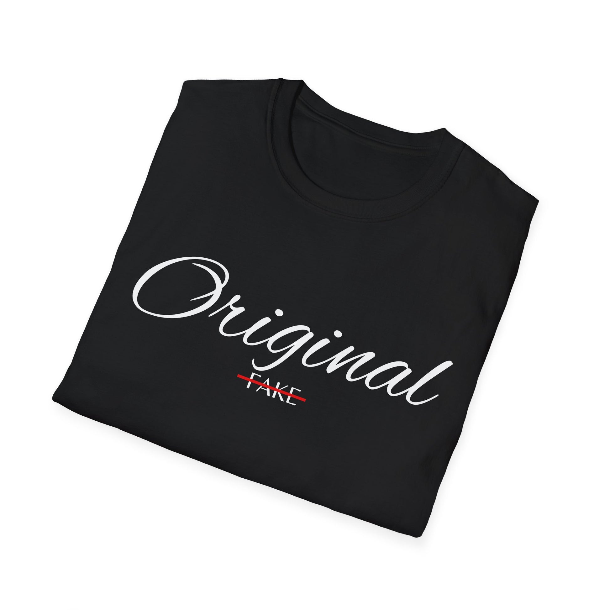 Original (crossed-out 'Fake') T-Shirt — Vintage Script Graphic Tee