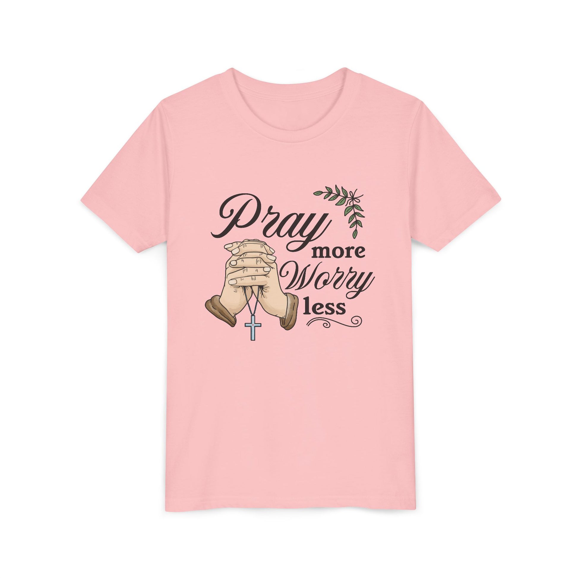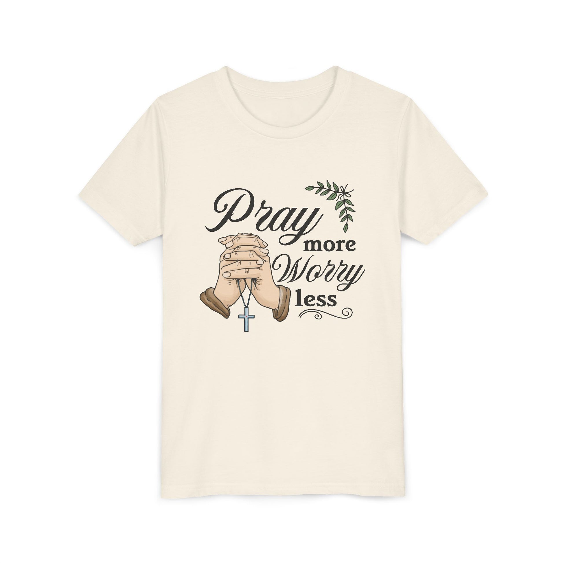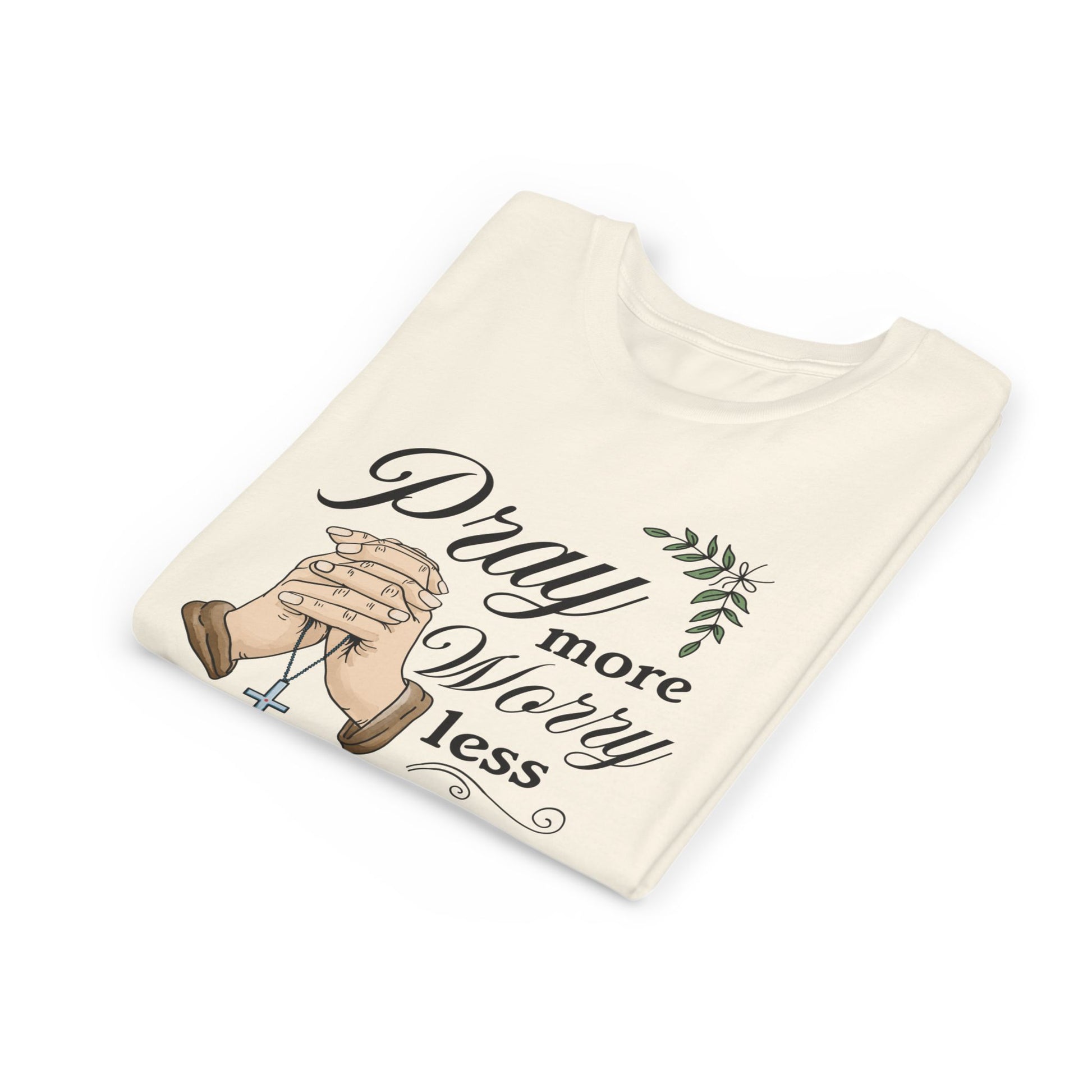 This lightweight youth tee carries a gentle, faith-forward message in a soft, wearable package. A warm illustration of folded hands and a simple cross sits beneath graceful script that reads “Pray more, Worry less,” creating a calm, reassuring focal point. The airy cotton feels like a quiet hug on a busy day — easy to layer under jackets or wear solo during morning routines, Sunday gatherings, or restful evenings at home. Subtle olive sprigs add a natural touch that keeps the design youthful and sincere. It’s designed to move with kids, hold its shape, and stay comfortable through play, prayer time, and family moments.