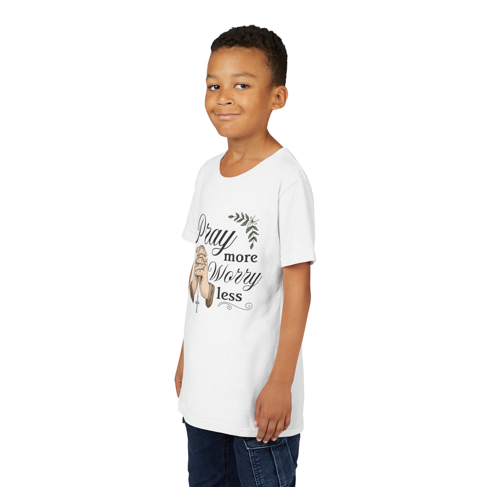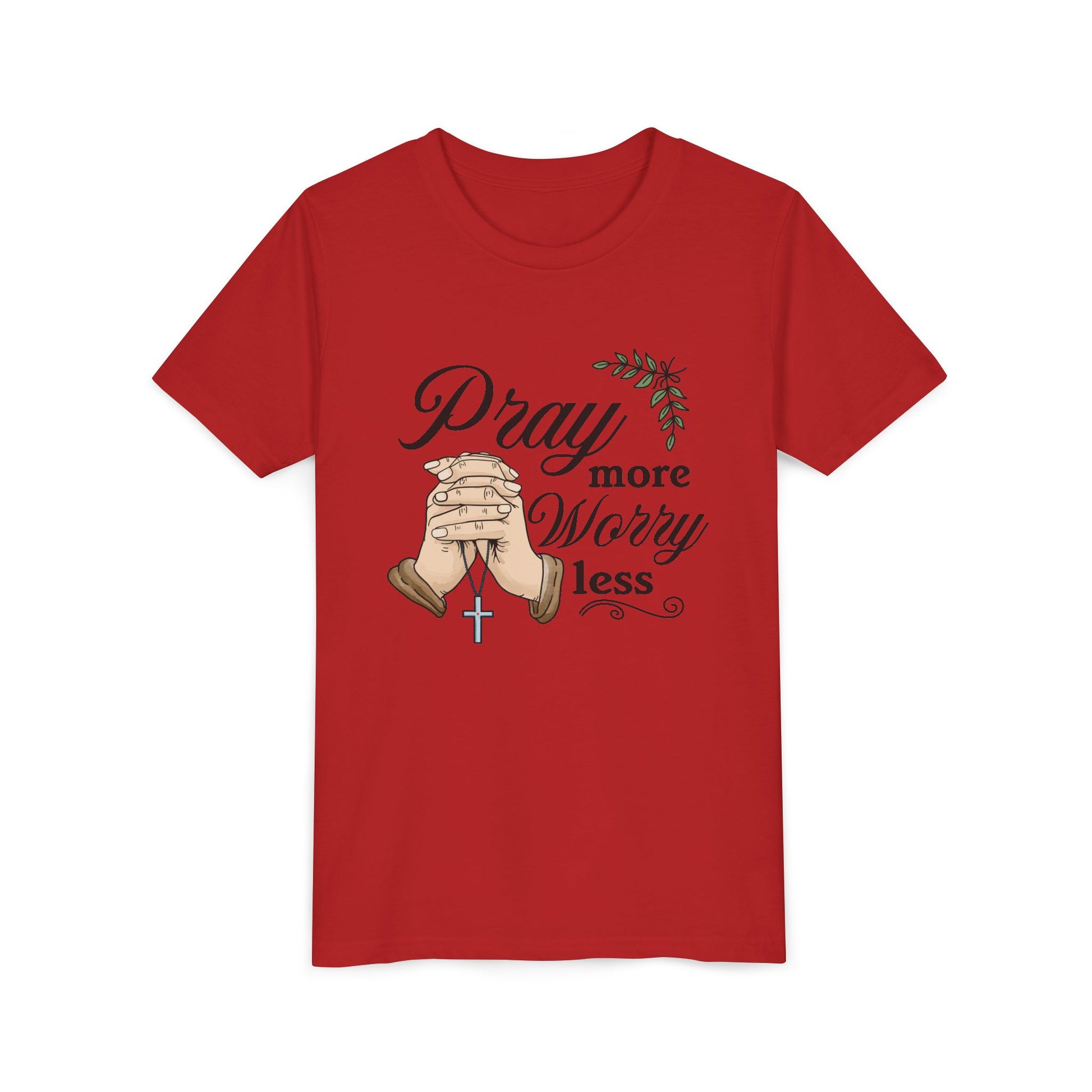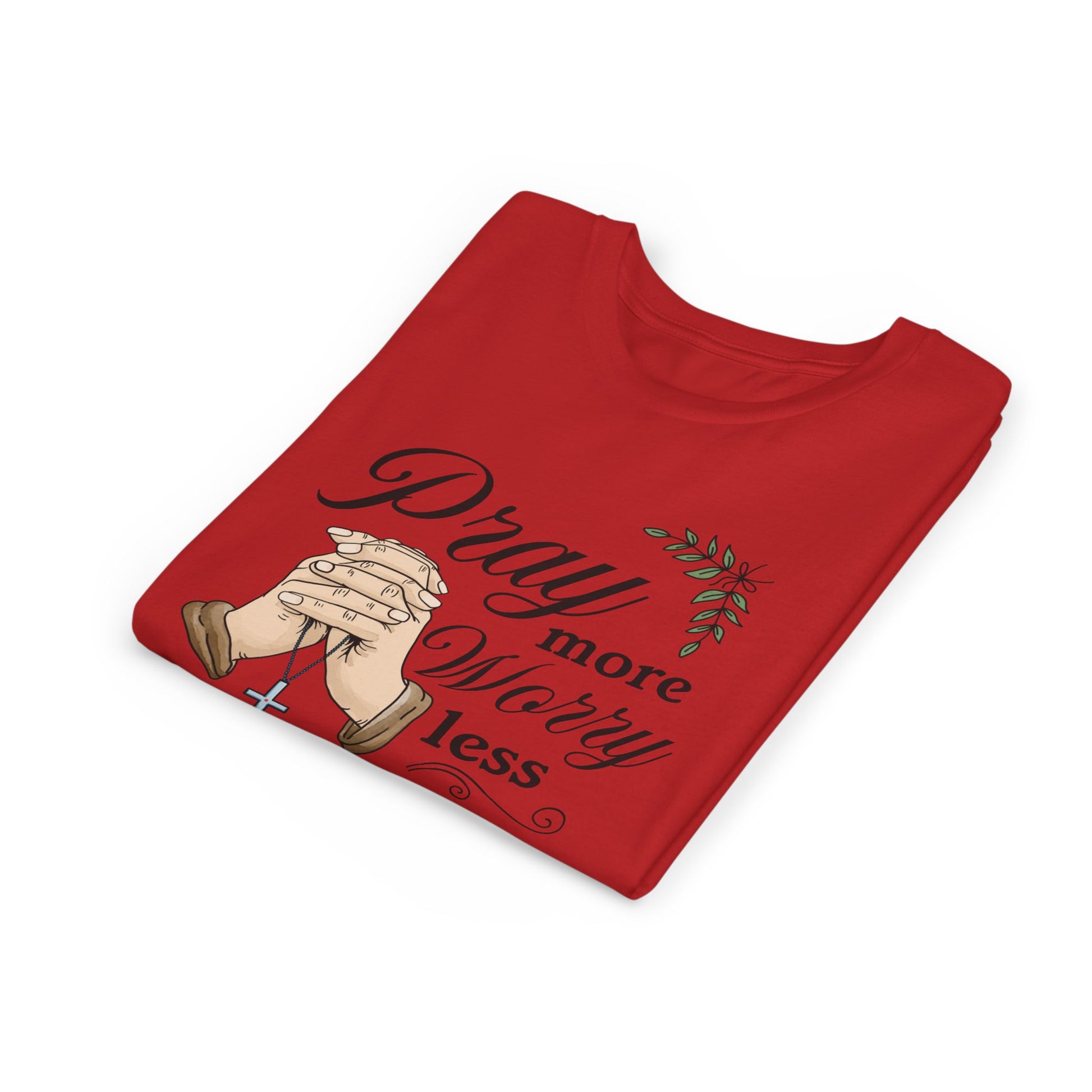 This lightweight youth tee carries a gentle, faith-forward message in a soft, wearable package. A warm illustration of folded hands and a simple cross sits beneath graceful script that reads “Pray more, Worry less,” creating a calm, reassuring focal point. The airy cotton feels like a quiet hug on a busy day — easy to layer under jackets or wear solo during morning routines, Sunday gatherings, or restful evenings at home. Subtle olive sprigs add a natural touch that keeps the design youthful and sincere. It’s designed to move with kids, hold its shape, and stay comfortable through play, prayer time, and family moments.
