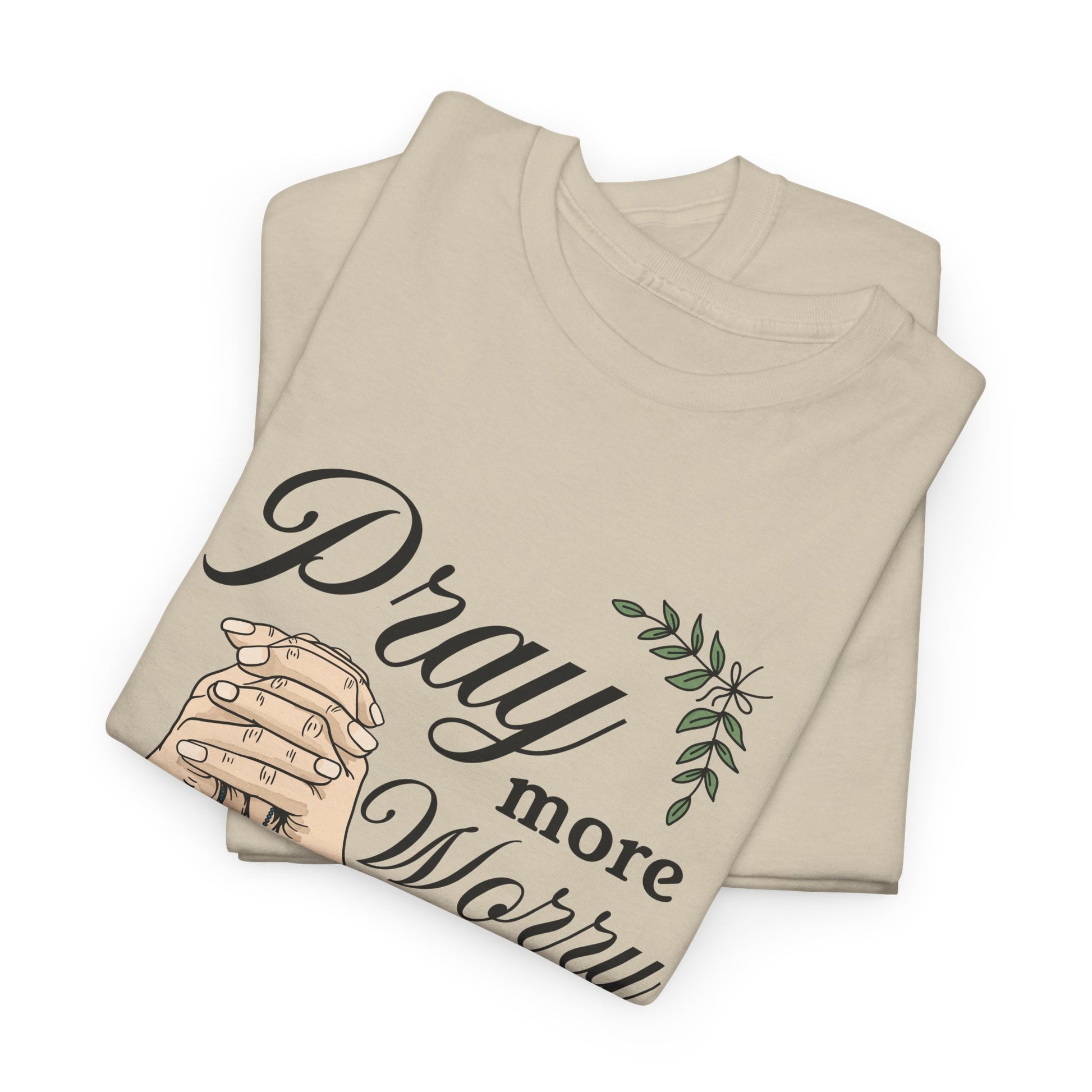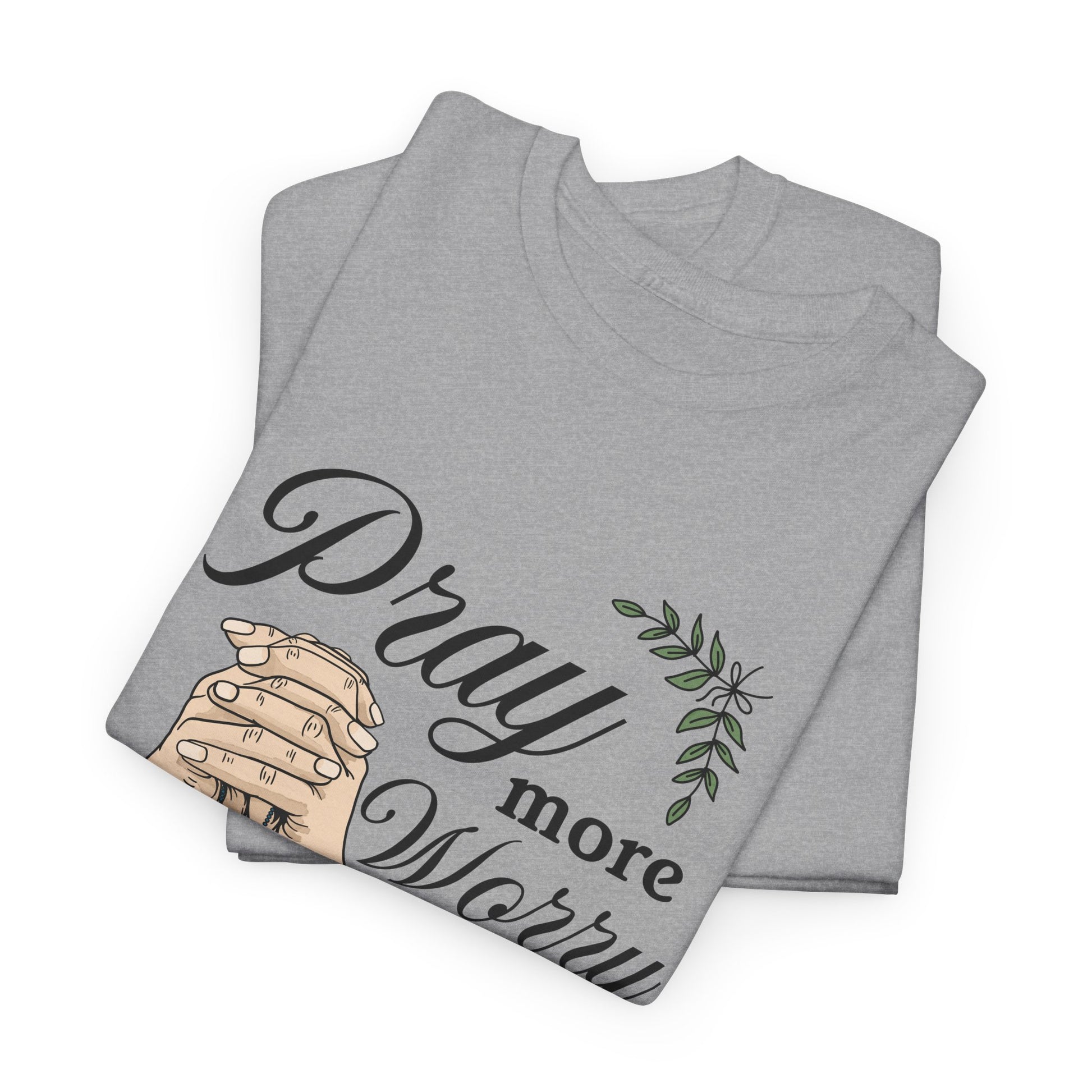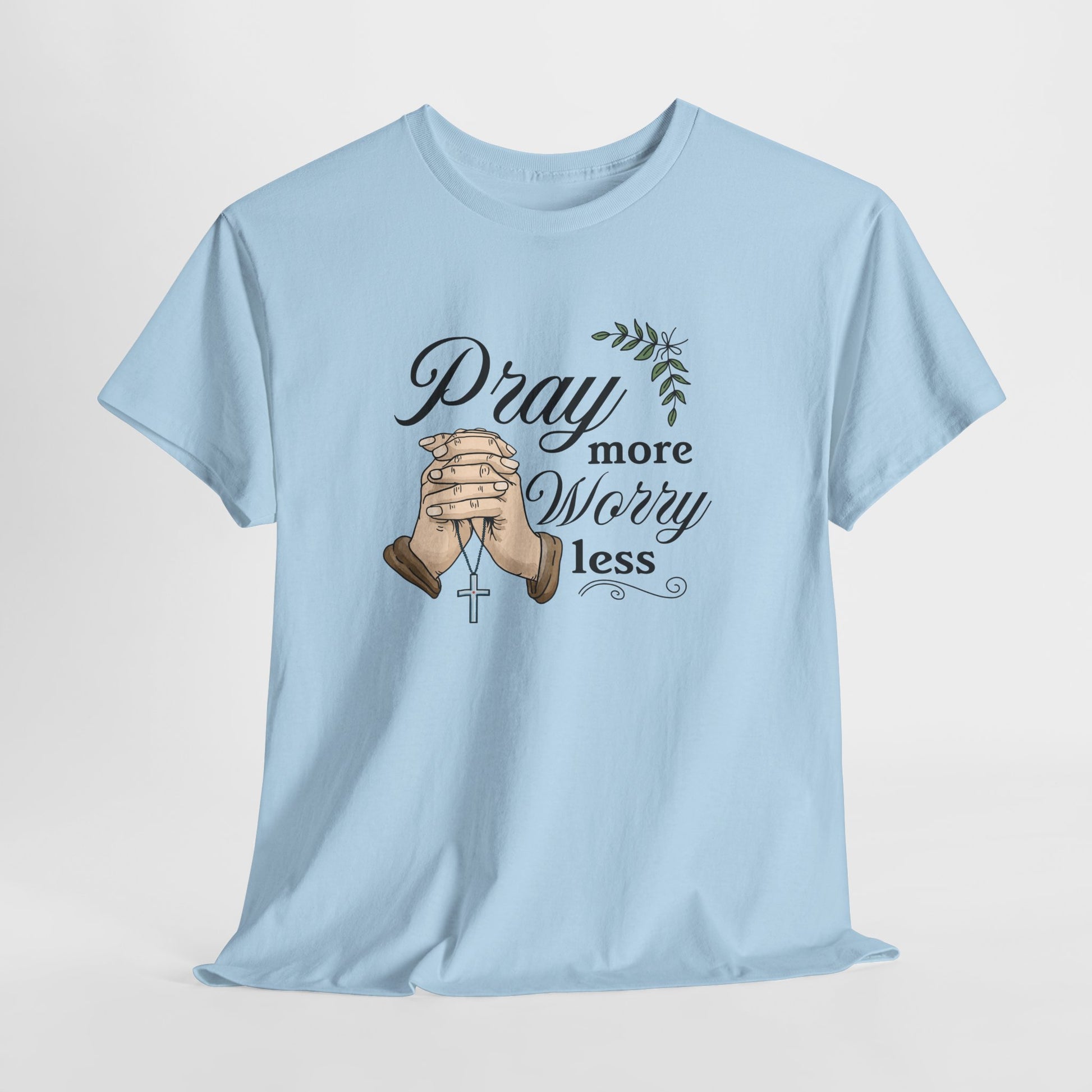 Soft, everyday comfort that carries a quiet message. This classic cotton tee features a gentle script reading "Pray more Worry less" with folded hands and a small cross — a subtle, faith-forward design meant to be worn with calm confidence. The relaxed crew neck and classic fit let the design sit naturally on the chest, while the smooth, durable fabric holds printed detail wash after wash. Wear it to church, to a small group, or on slow Sunday mornings when you want your clothes to reflect the quiet center of your day.