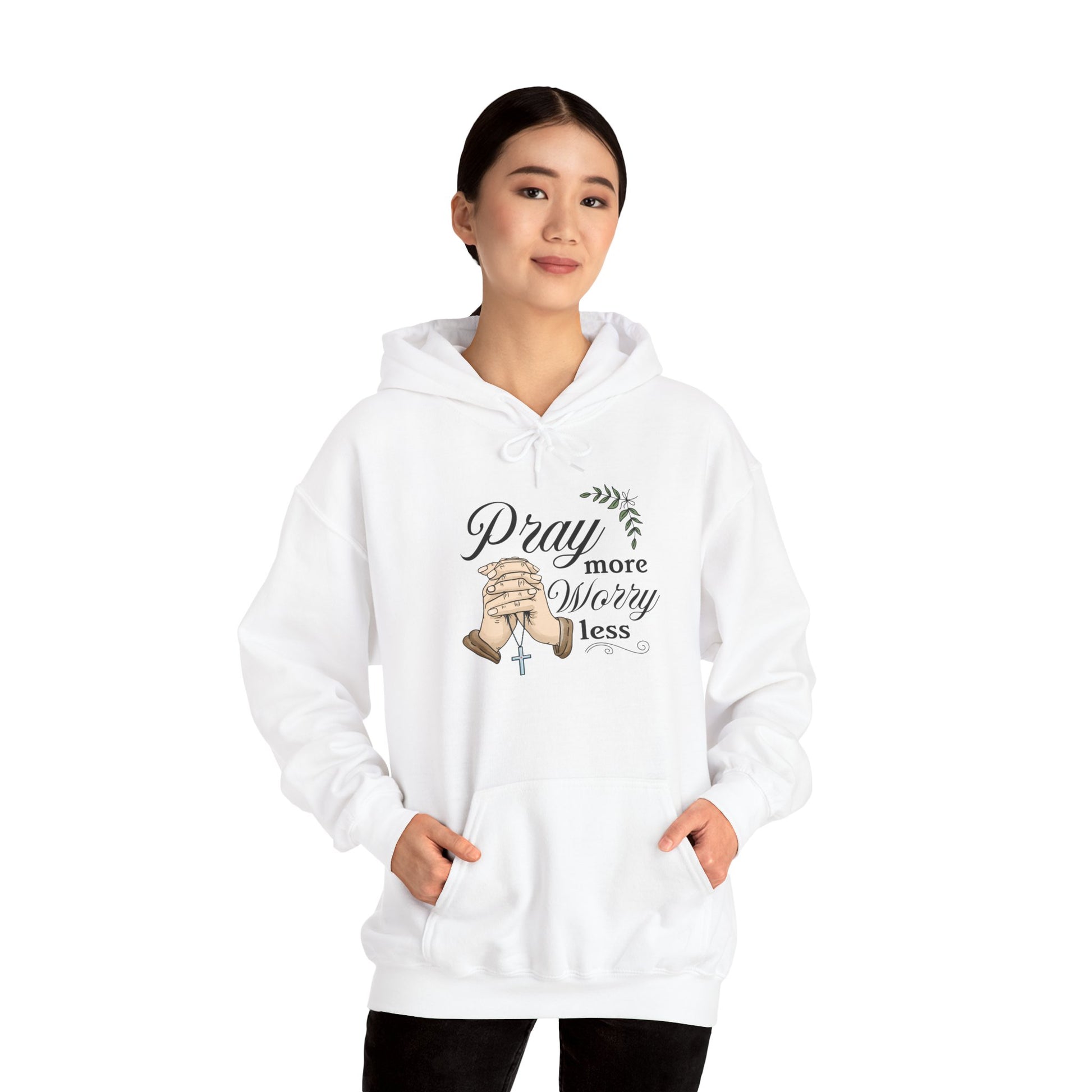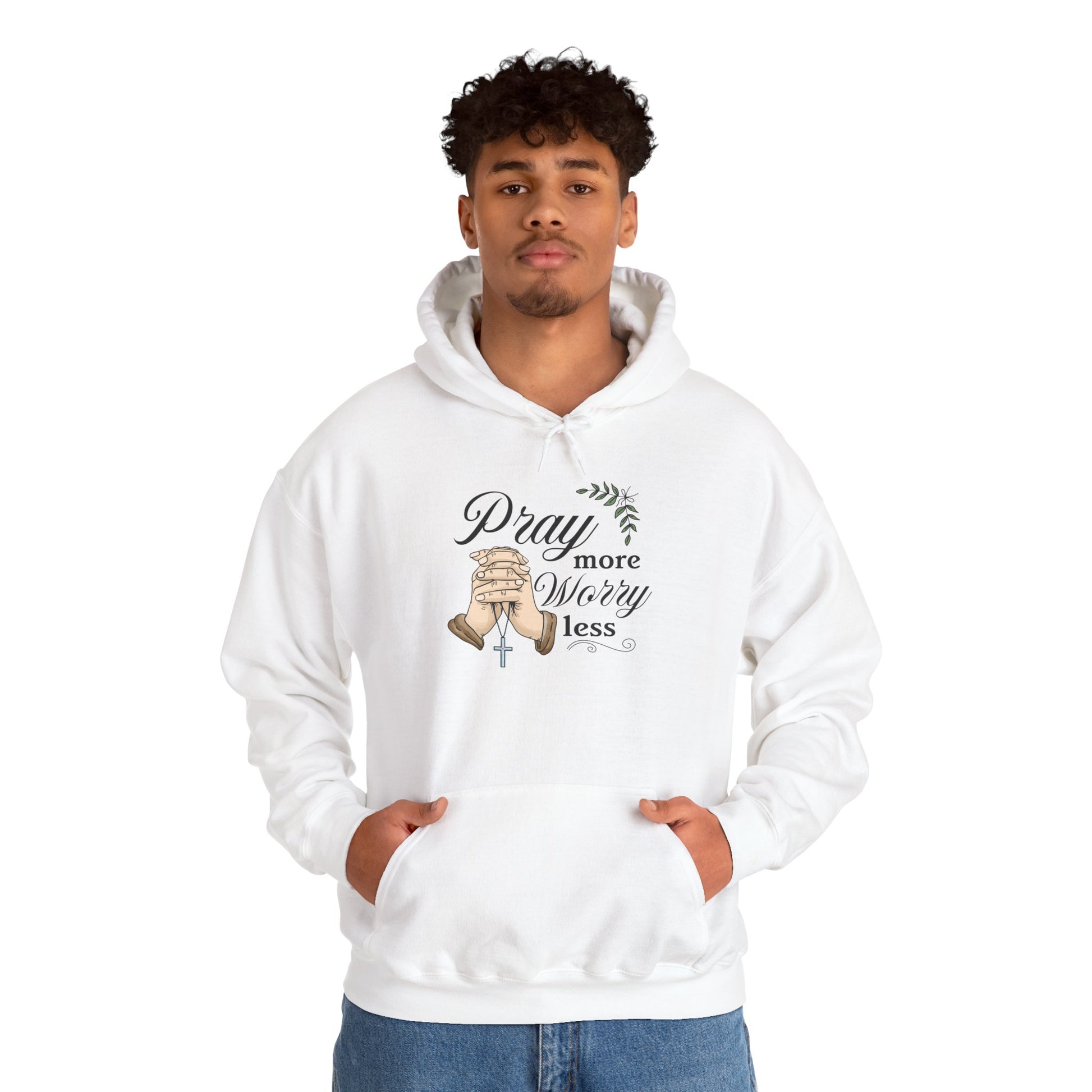 Soft, warm hoodie that carries a quiet reminder: Pray more, worry less. The simple prayer-hands artwork and gentle script sit centered on a cozy white pullover, bringing calm to rushed mornings, long drives, or evenings at home. The roomy kangaroo pocket and double-lined hood offer practical comfort while the smooth cotton-poly blend keeps the print crisp and the fabric resilient. Wear it to church, small group nights, or when you need a wearable nudge toward stillness and faith.