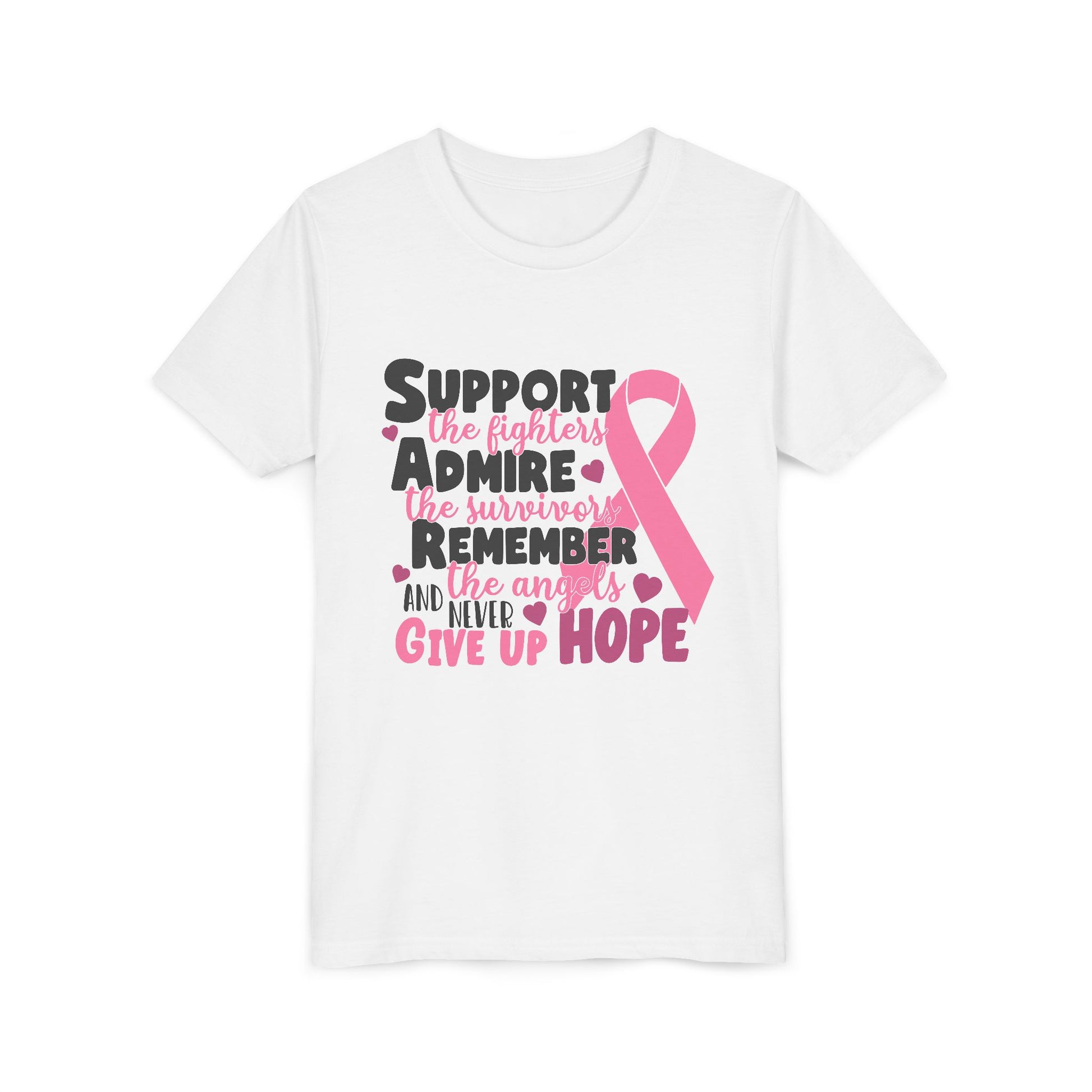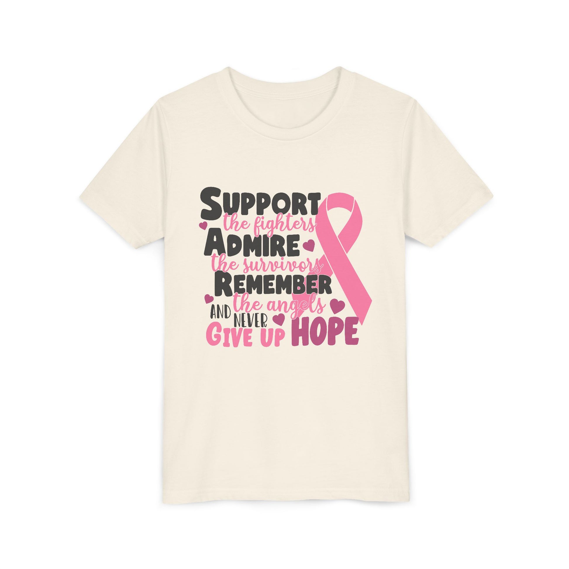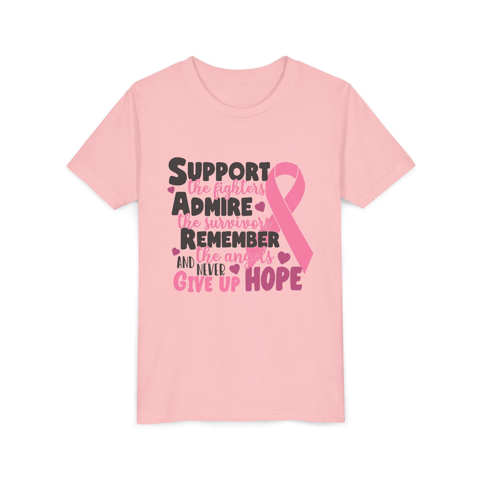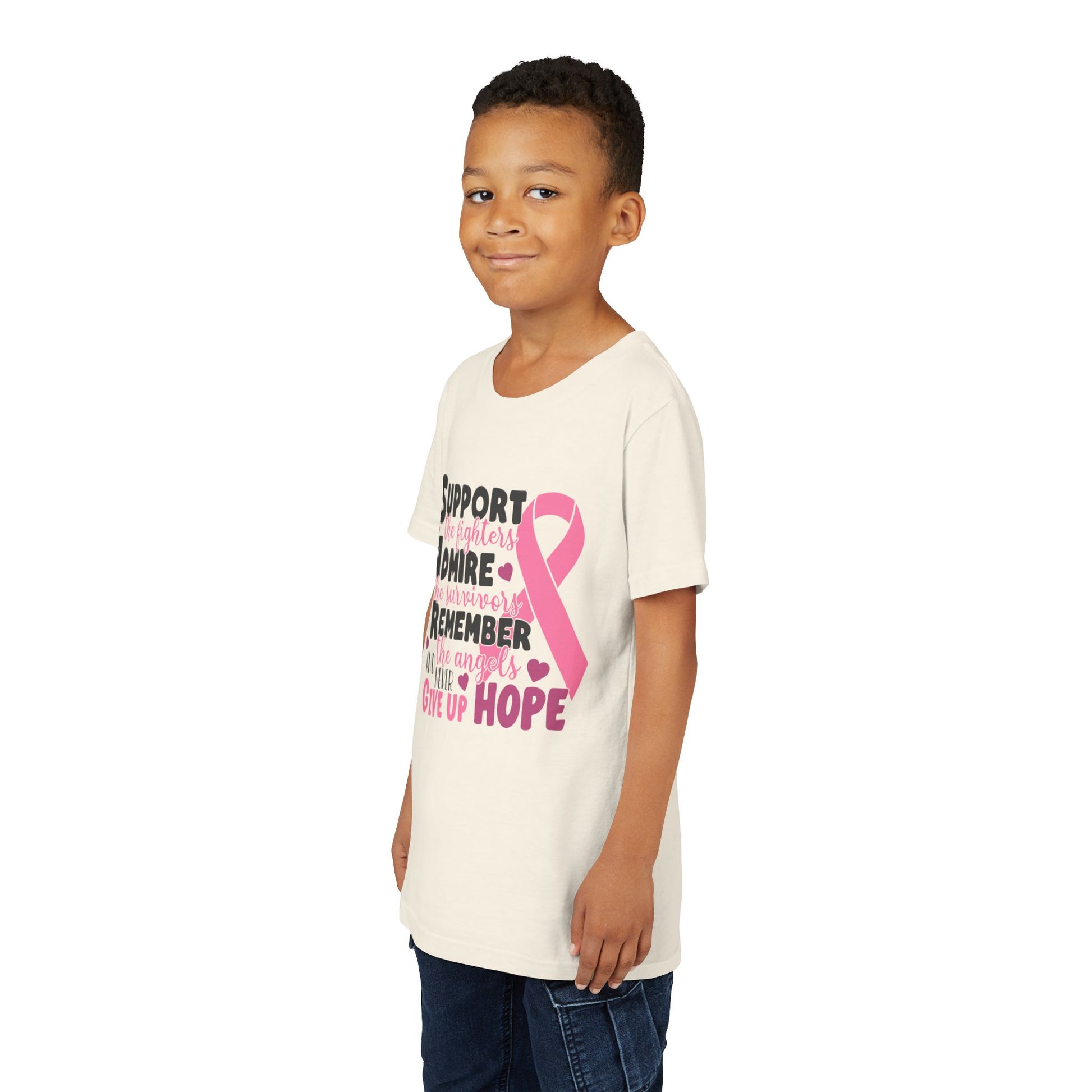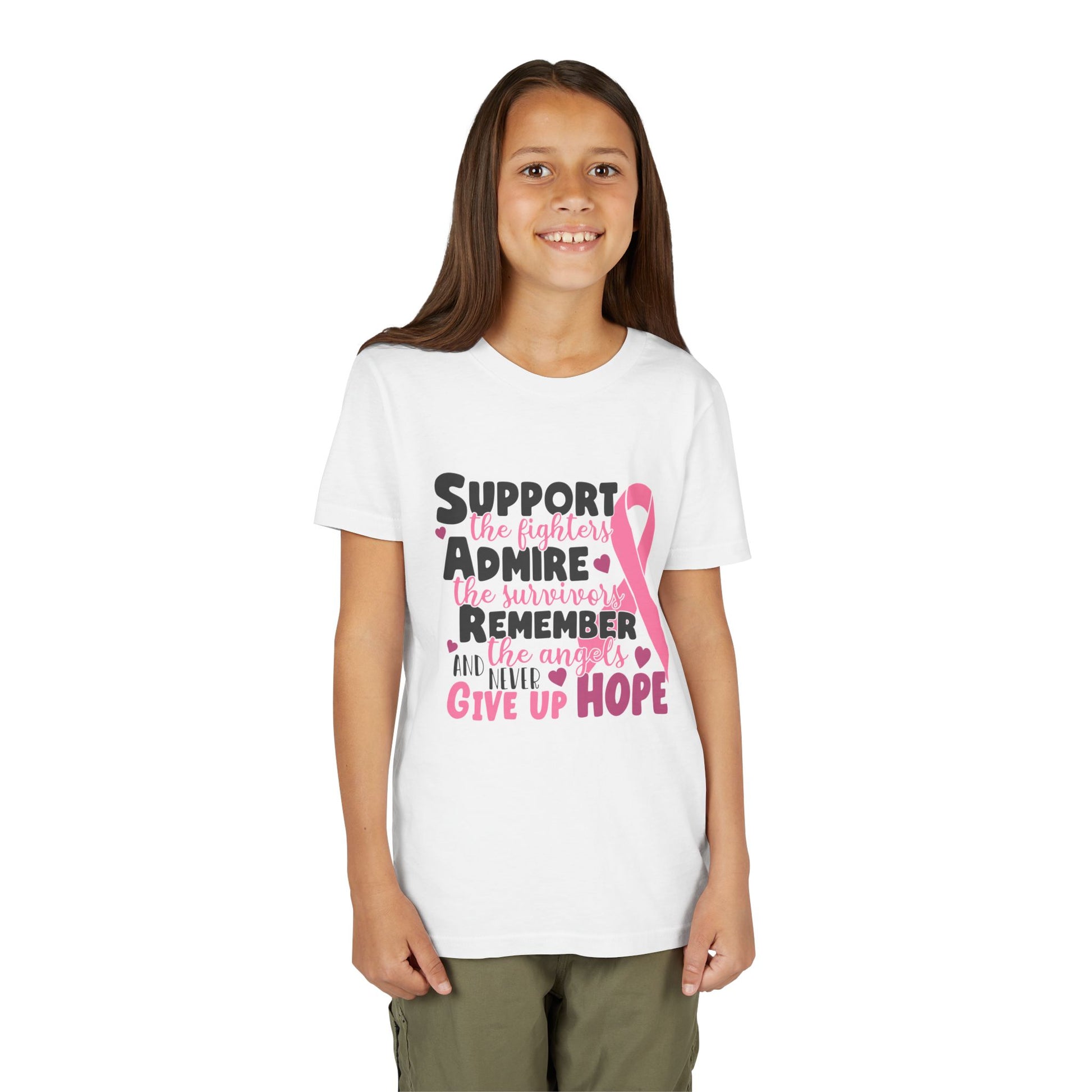 This lightweight youth tee carries a gentle, heartfelt message — a soft pink awareness ribbon paired with encouraging words that honor fighters, survivors, and those remembered. The airy, ring-spun cotton feels barely-there against the skin, while the retail fit and clean crew neckline keep the look modern and wearable. It sits naturally in everyday life: layered under a cardigan for clinic visits, worn with jeans at awareness walks, or kept in the car for moments when a quiet show of support matters most. The design speaks softly but clearly, offering comfort and solidarity without shouting. Thoughtful details like shoulder tape, side seams, and a tear-away label mean the shirt keeps its shape and stays comfortable wash after wash, so the message endures as long as the cause it represents.