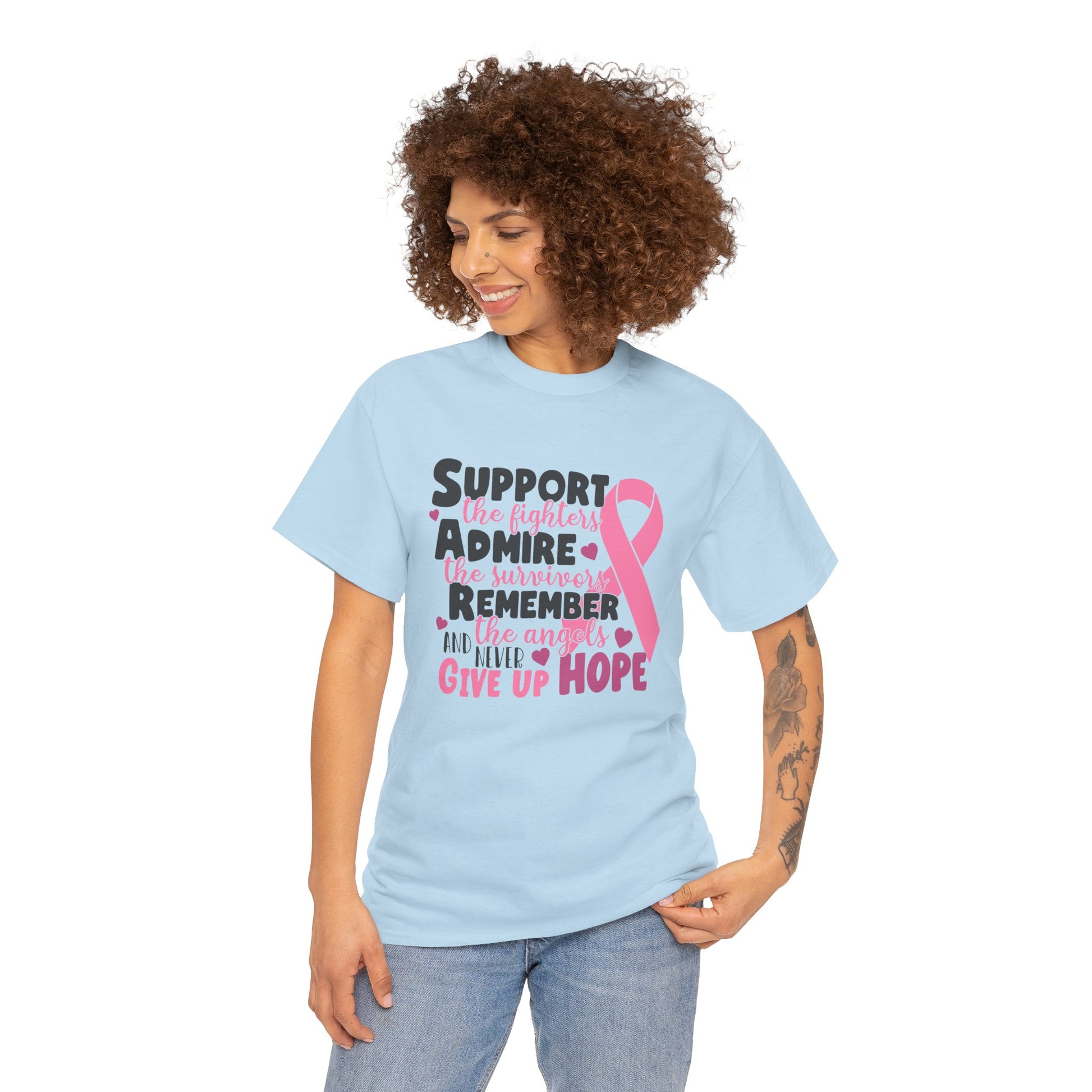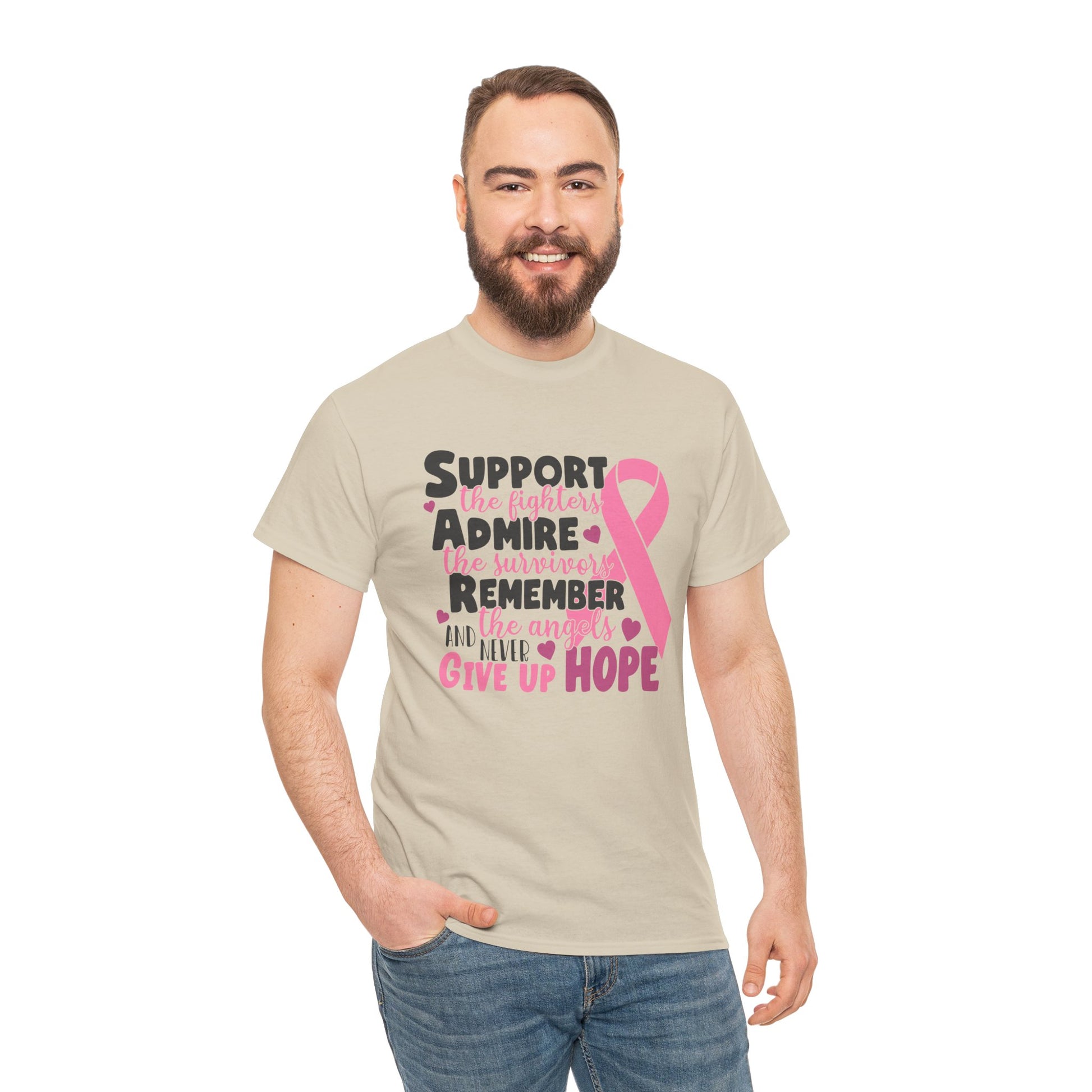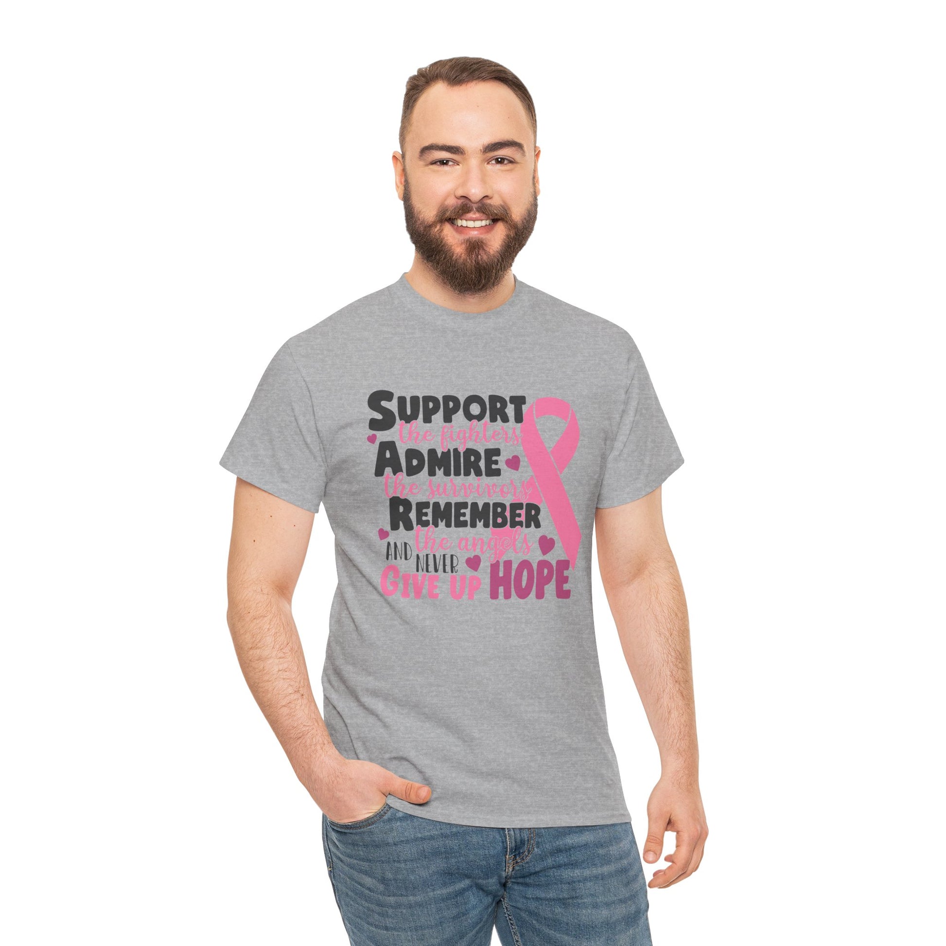 Carry a quiet message of strength and solidarity with this soft, classic tee. The design layers encouraging words—Support, Admire, Remember, Hope—around a pink awareness ribbon, creating a wearable reminder to stand with survivors and honor their journeys. The shirt’s relaxed crew neck and timeless cut make it easy to slip on for awareness walks, fundraising events, or everyday wear when you want to share support without saying a word. It feels lived-in from the first wear, letting the message be the focus while the fabric stays comfortable and reliable.