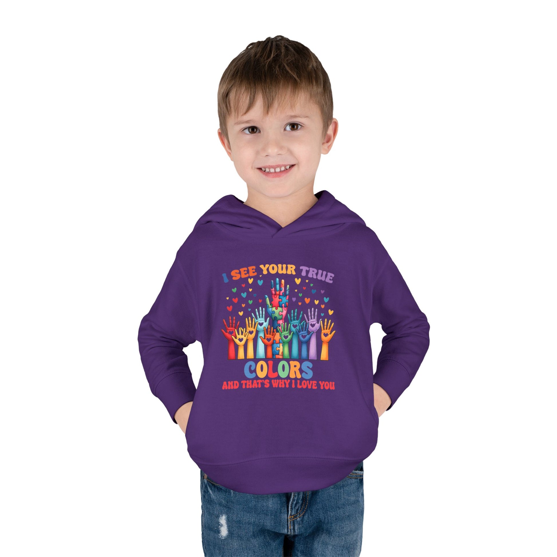 Soft, cozy toddler hoodie with a bright, rainbow-hands design that celebrates self-expression and love. The cheerful print reads “I see your true colors and that’s why I love you,” surrounded by colorful hands and tiny hearts. Lightweight but warm, it layers easily over tees for playground days, family outings, or quiet cuddle time. The roomy hood and side pockets give little ones comfort and a place to tuck their treasures. Gentle fabric and thoughtful construction keep shape and color through washes so this hoodie stays part of everyday moments.