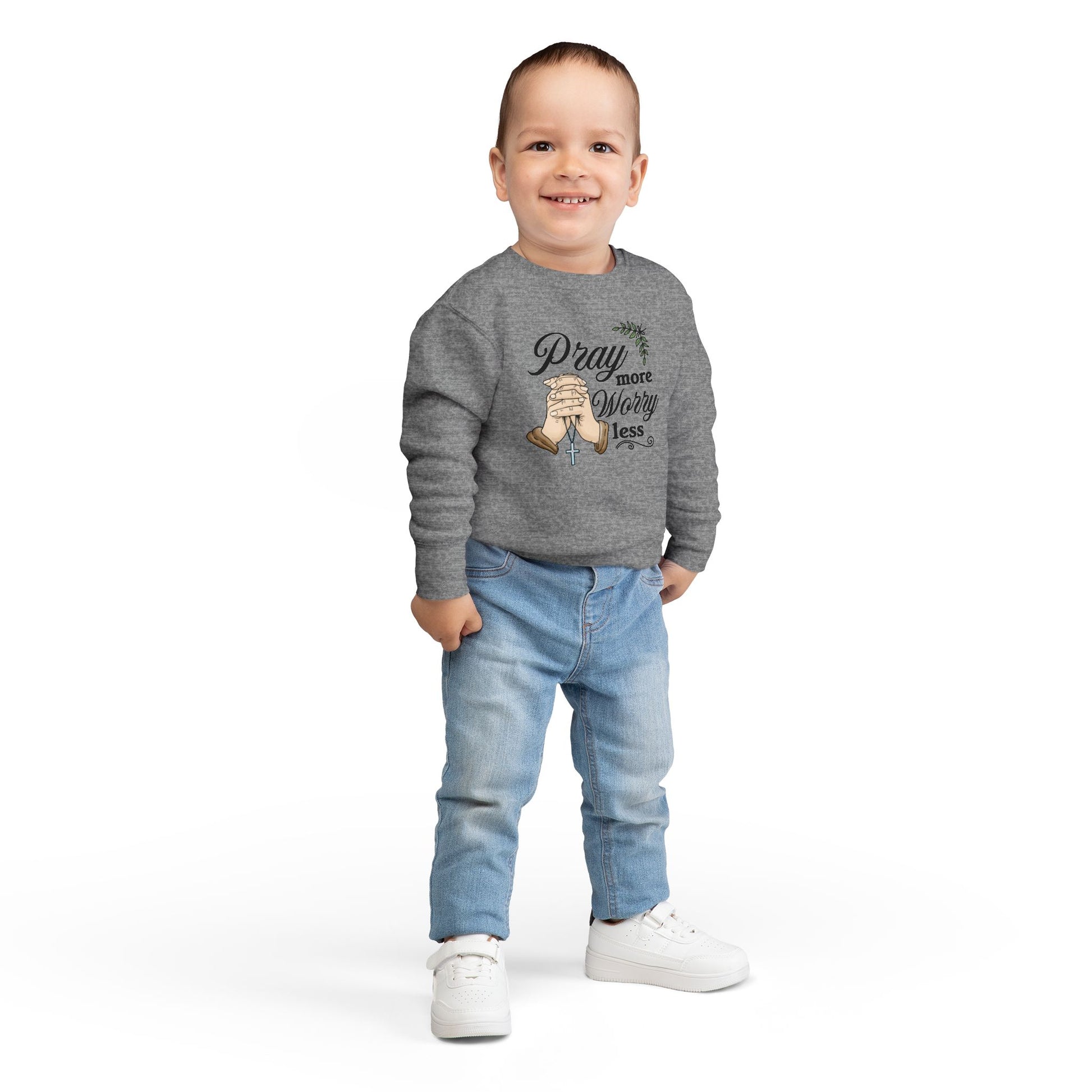 Soft, cozy, and quietly hopeful — this toddler sweatshirt wraps little ones in gentle comfort while sharing a simple message of faith. The design pairs warm, illustrated praying hands and a small cross with the words “Pray more Worry less,” arranged in a flowing, hand-lettered style. In neutral heather tones the sweatshirt feels calm and approachable, made to be worn during slow mornings, family church days, or cuddle-time on the couch. The medium-weight fabric and ribbed cuffs hold shape through play, and the tear-away label keeps tiny necks scratch-free. It’s the kind of piece parents reach for when they want clothing that’s both comfortable and quietly meaningful.